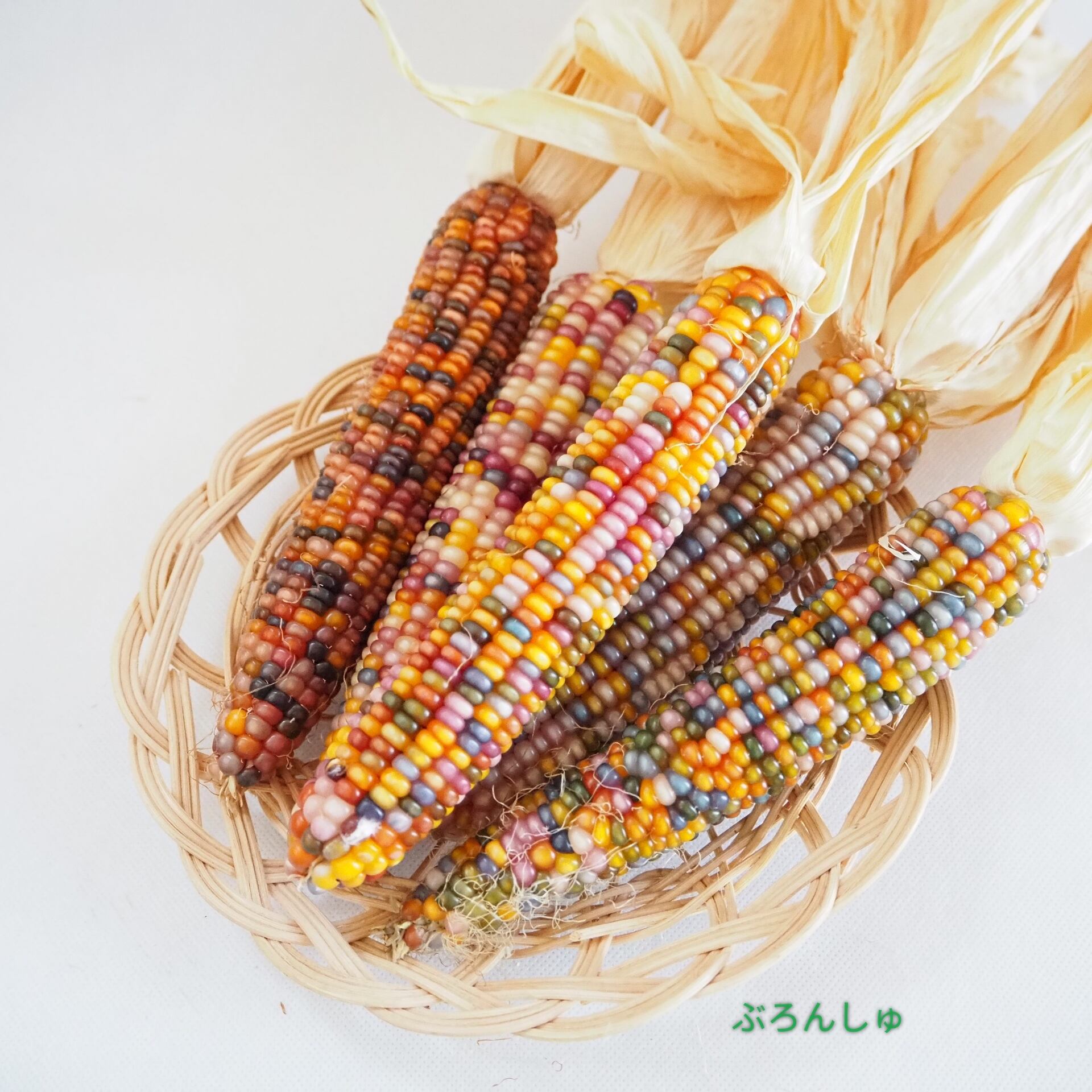無農薬で大切に育ったカラフルな爆裂種のとうもろこしです。グラスジェムコーンは自然の物ですので、大きさや太さがそれぞれ違います。写真は一例で、カゴは装飾品・油性マジックは大きさ比較検討用で販売しておりません。