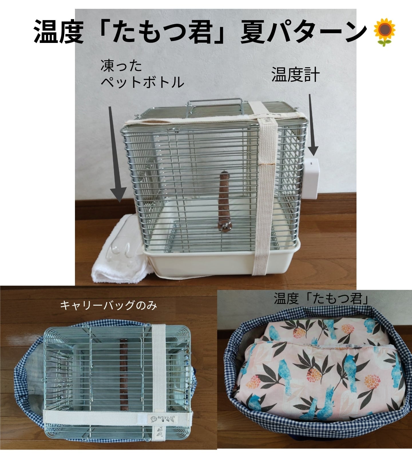 ※キャリーバッグに保温器具(保冷剤)を入れてお使いになる場合、鳥さんが暑く(寒く)なりすぎないよう温度を確認しながらお使いください。また火傷などにならないよう保温器具は鳥さんが直接触れないようになさってください。