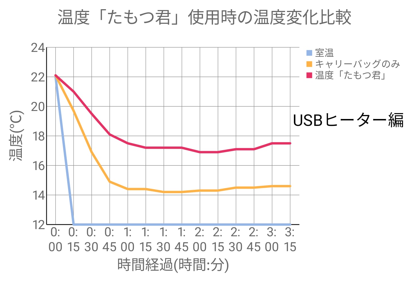 「たもつ君」を使用していない【キャリーバッグ+USBヒーター】とは、2.5度ほど差が出ました。