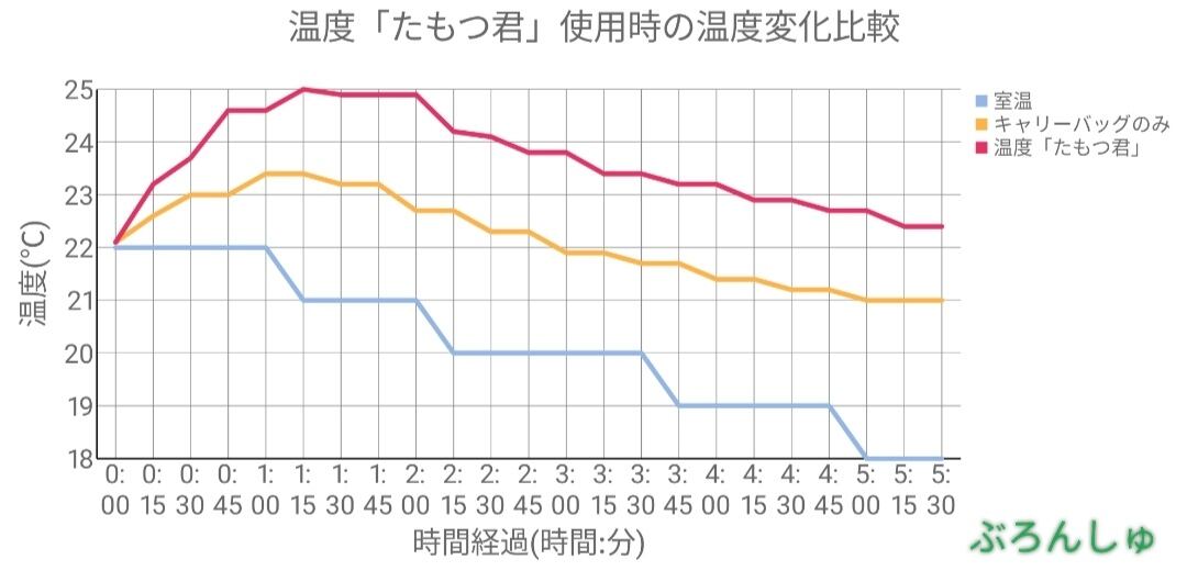 【キャリーバッグ+湯たんぽ】と【たもつ君+キャリーバッグ+湯たんぽ】の差は大体4.5度ほどあり、「たもつ君」の効果がよく現れた結果となりました。