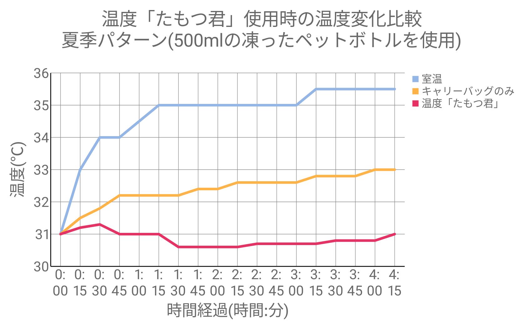 外気温が35~35.5度まで上がりましたが、「たもつ君」を使用すると31度以下を4時間半以上キープ。